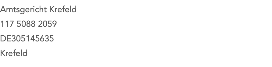 Gerichtsstand: Steuernummer: Umsatzsteuer-Id: Erfüllungsort: Amtsgericht Krefeld 117 5088 2059 DE305145635 Krefeld