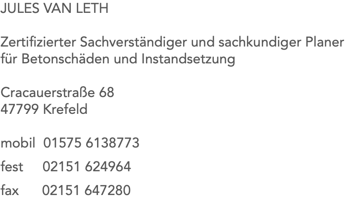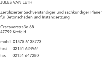JULES VAN LETH Zertifizierter Sachverständiger und sachkundiger Planer für Betonschäden und Instandsetzung Cracauerstraße 68 47799 Krefeld mobil 01575 6138773 fest 02151 624964 fax 02151 647280 mail@soll-ist.com