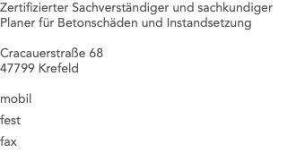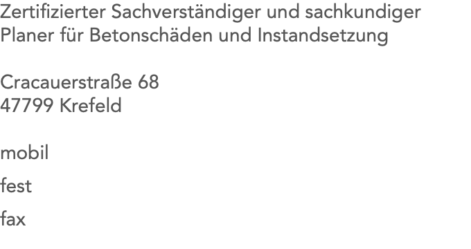 Zertifizierter Sachverständiger und sachkundiger Planer für Betonschäden und Instandsetzung Cracauerstraße 68 47799 Krefeld mobil fest fax 01575 6138773 02151 624964 02151 647280